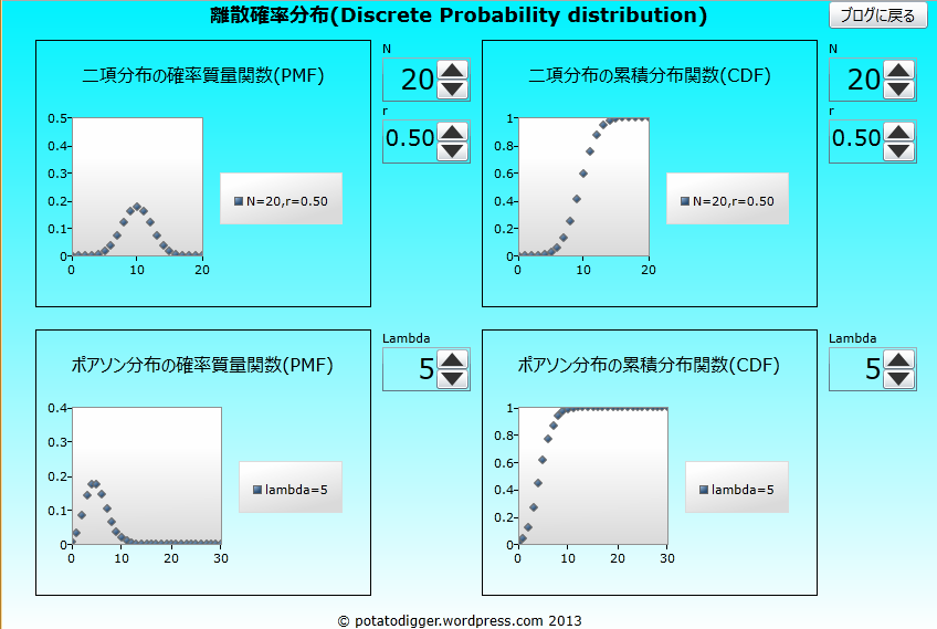 ブログにPMF/CDFプログラムソースを掲載しました。(二項分布の関数も含む) サンプルプログラム 二項分布と同じコンテンツです。 説明:Wikipedia |